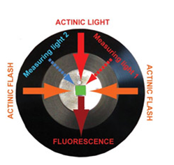 FL6000雙調(diào)制葉綠素熒光儀是FL3500雙調(diào)制葉綠素熒光儀的最新升級版,專門用于對藍綠藻或綠藻等微藻,葉綠體或類囊體懸浮物進行光合作用深入機理研究的強大科研工具。儀器具備雙通道測量控制,可控制測量樣品的溫度,并配備單翻轉(zhuǎn)光(STF),內(nèi)置多種可用戶自行修改的測量程序,可進行目前國際上對于葉綠素熒光的各種深入機理研究。其核心結(jié)構(gòu)是包含了一個懸浮液標準樣品杯的光學測量頭,內(nèi)置3組LED光源和1個1MHz/16位 AD 轉(zhuǎn)換的PIN二極管信號檢測器。AD轉(zhuǎn)換的增益和積分時間可以通過軟件控制。檢測器測量葉綠素熒光信號的時間分辨率可高達4 μs(快速版為1μs)。