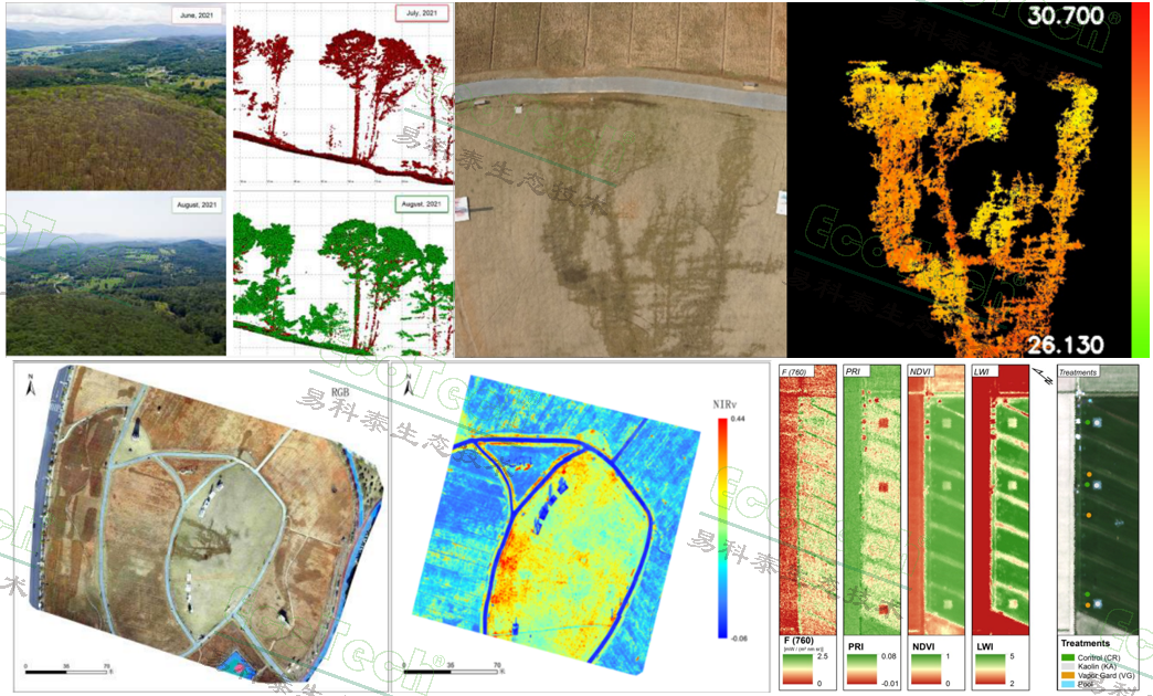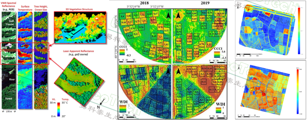 上左圖引自Bruce D. Cook等,NASA Goddard’s LiDAR, Hyperspectral and Thermal (G-LiHT) Airborne Imager, Remote Sensing 2013;上中圖引自Pancorbo J L ,Camino C , Alonso-Ayuso M , et al. Simultaneous assessment of nitrogen and water status in winter wheat using hyperspectral and thermal sensors[J]. European Journal of Agronomy, 2021, 127(3):126287.);上右圖為水稻田表型成像分析(易科泰光譜成像與無人機(jī)遙感研究中心提供)
