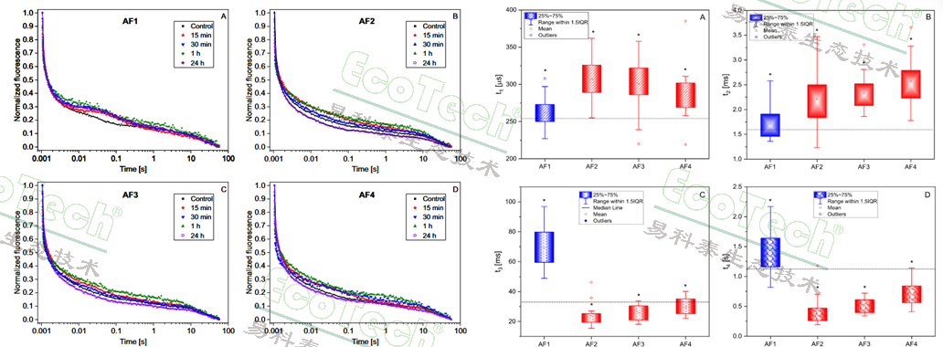 通過對Q-A再氧化動力學在線監(jiān)測,更詳細地理解電子傳遞過程以及PSII在不同環(huán)境條件下的動態(tài)行為(參見下圖)。結(jié)果表明,AF涂層對Q-A再氧化動力學有顯著影響,不同AF處理下動力學曲線呈現(xiàn)出不同的模式。研究人員引入了特征時間常數(shù)(ti)這一概念進一步分析Q-A再氧化動力學,將動力學響應曲線分為快相(phase)、中期相和慢相幾個階段,可以看出,含有最高除藻劑濃度的AF1組其特征時間常數(shù)(藍色柱)與其它組有非常大的差異,以上分析涵蓋了從微秒到秒級的時間尺度。