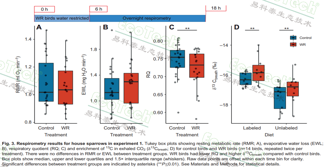 研究者給圈養(yǎng)的家麻雀喂食13C標(biāo)記的亮氨酸9周,以標(biāo)記內(nèi)源性蛋白質(zhì)。每周進(jìn)行一次試驗(yàn),在此期間,測(cè)量了對(duì)限水的生理反應(yīng),如瘦體重、脂肪量、新陳代謝的變化以及呼出二氧化碳中13C 的富集(δ13Cbreath)。研究發(fā)現(xiàn),限水的鳥(niǎo)類分解代謝了更多的瘦肉組織,并且還富集了δ13Cbreath以響應(yīng)限水。然而,δ13Cbreath隨代謝率和限水期的長(zhǎng)短而變化,這表明當(dāng)可以使用其它生理策略實(shí)現(xiàn)水分平衡時(shí),鳥(niǎo)類可能會(huì)節(jié)省蛋白質(zhì)。
