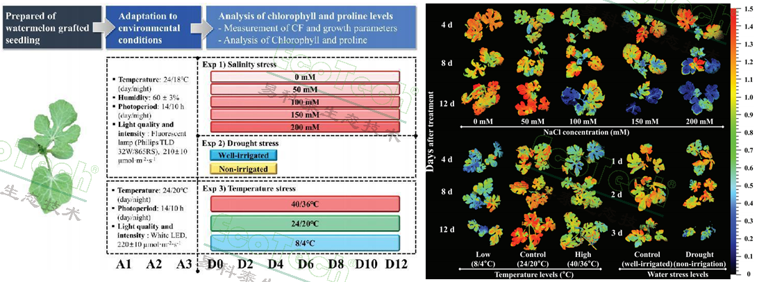 一、 利用葉綠素?zé)晒獬上癖O(jiān)測嫁接西瓜幼苗的鹽度、溫度和干旱脅迫
