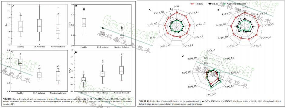 通過分析葉綠素?zé)晒獬上癯S脜?shù),確定黃龍病對柑橘葉片的影響;通過蜘蛛圖法分析了與脅迫誘導(dǎo)光合作用過程變化相關(guān)的葉綠素?zé)晒獯銣鐓?shù),反映了不同葉片條件下熒光參數(shù)的相對變化。與健康樣本相比,HLB感染、營養(yǎng)缺乏的葉片熒光淬滅參數(shù)呈現(xiàn)顯著差異。