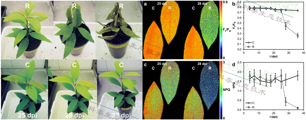 鱷梨苗感染不同天數(shù)后外觀變化(R為感染組,C為對照組);葉片光合參數(shù)變化(a.最大光量子效率Fv/Fm,b. Fv/Fm定量分析,c.非光化學(xué)熒光淬滅NPQ,d.NPQ定量分析)