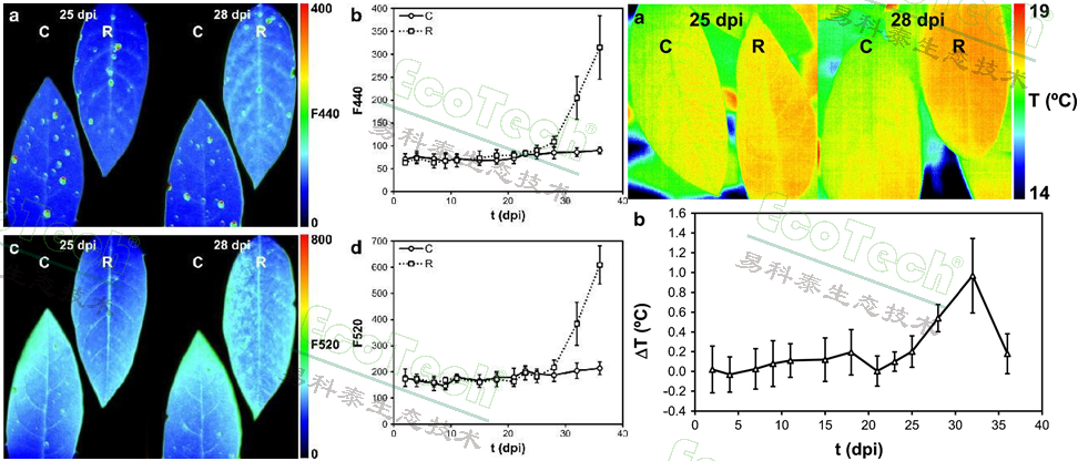 研究中還使用了多光譜熒光成像、紅外熱成像技術(shù)分別對次級代謝、葉片溫度進(jìn)行檢測,分析病害對鱷梨代謝、蒸騰作用的影響。結(jié)合葉綠素?zé)晒獬上?、多光譜熒光成像與紅外熱成像的方法,是一種診斷病菌侵染與病害發(fā)生的有效手段,且能在癥狀發(fā)生前,早期篩選潛在的受感染植物。