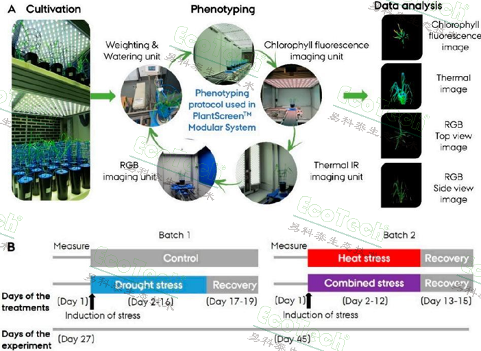 A:本研究中的PlantScreen表型系統(tǒng)工作流程:樣品在培養(yǎng)室中生長;在培養(yǎng)稱重/澆灌單元控制土壤含水量;在葉綠素?zé)晒猓ㄔu估光合性能)、熱紅外(分析蒸騰效率)、RGB(監(jiān)測植株生長動態(tài))三個成像單元中成像分析,B:樣品脅迫處理流程