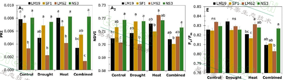 RGB成像結(jié)果顯示,NS3在所有脅迫下表現(xiàn)最優(yōu),生長速率最高,恢復(fù)能力強。LM19和LM62在干旱和復(fù)合脅迫下生長受限更明顯。SF1在單一脅迫下表現(xiàn)良好,但在復(fù)合脅迫下顯著受損。