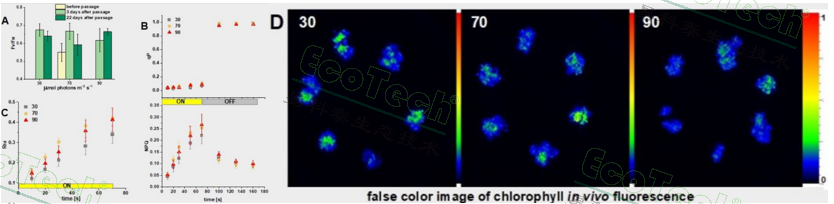 鹽度愈傷組織和幼苗的影響,主要通過抗氧化酶活性和光合效率兩個(gè)方面檢測(cè)。其中,F(xiàn)luorCam葉綠素?zé)晒獬上窦夹g(shù)結(jié)果顯示,無論氯化鈉濃度如何,愈傷組織的Fv/Fm值始終低于幼苗。這可能是由于這兩種植物材料的光合裝置成熟度存在差異所致,幼苗葉片中的細(xì)胞組織能夠更加高效地利用光能并最小化其過量造成的損傷。這也揭示了植物不同發(fā)育階段(或組織類型)光合系統(tǒng)的成熟度與脅迫耐受性的關(guān)聯(lián),為深入研究植物抗逆機(jī)制提供了數(shù)據(jù)支持