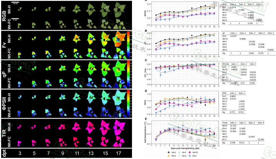 葉綠素?zé)晒鈪?shù)ΦPSII(PSII有效量子產(chǎn)量)和 qP(光化學(xué)淬滅系數(shù))是區(qū)分不同病毒處理嚴(yán)重程度的最敏感參數(shù),在感染第3天即可明顯指示病害發(fā)生。癥狀嚴(yán)重的植株(Wt-FC,R3-F)這兩個(gè)值均顯著降低,表明其光化學(xué)反應(yīng)中心效率低下。葉片溫度在癥狀嚴(yán)重的植株中更高,這可能是由于氣孔關(guān)閉導(dǎo)致蒸騰作用減少所致。TIR成像在感染早期(約7天后)就能檢測(cè)到溫度差異。
