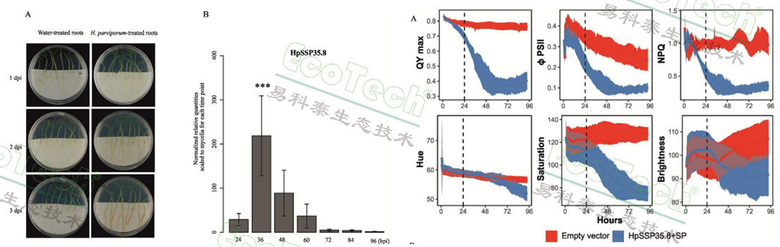 左圖:接種病菌的云杉根部和HpSSP35.8的表達(dá)動(dòng)力學(xué);右圖:本氏煙葉片的葉綠素?zé)晒馀cRGB彩色成像參數(shù)動(dòng)態(tài)變化,葉綠素?zé)晒鈪?shù)包括QYmax、ΦPSII和NPQ,RGB彩色成像圖轉(zhuǎn)化為色調(diào)飽和度數(shù)據(jù)(Hue-Saturation-Brightness)
