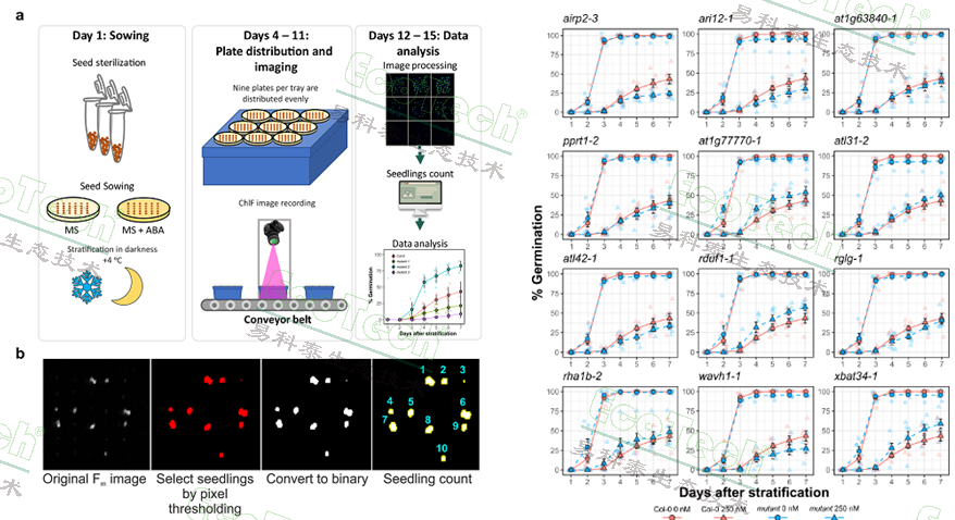 左圖:高通量葉綠素?zé)晒獬上穹治龉ぷ髁鞒?;a.播種、放置樣品、成像測(cè)量、圖像分析;b.最大葉綠素?zé)晒釬m成像圖的分析過程;右圖:不同處理的發(fā)芽率動(dòng)態(tài)曲線