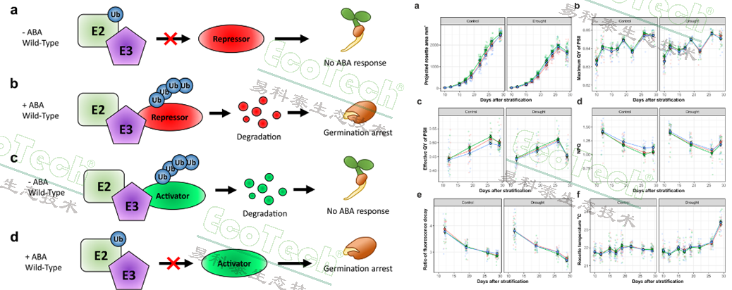 左:泛素E3連接酶在ABA反應(yīng)途徑中的功能假說;右:對(duì)應(yīng)處理的冠層投影面積、各項(xiàng)葉綠素?zé)晒鈪?shù)、冠層溫度的動(dòng)態(tài)曲線