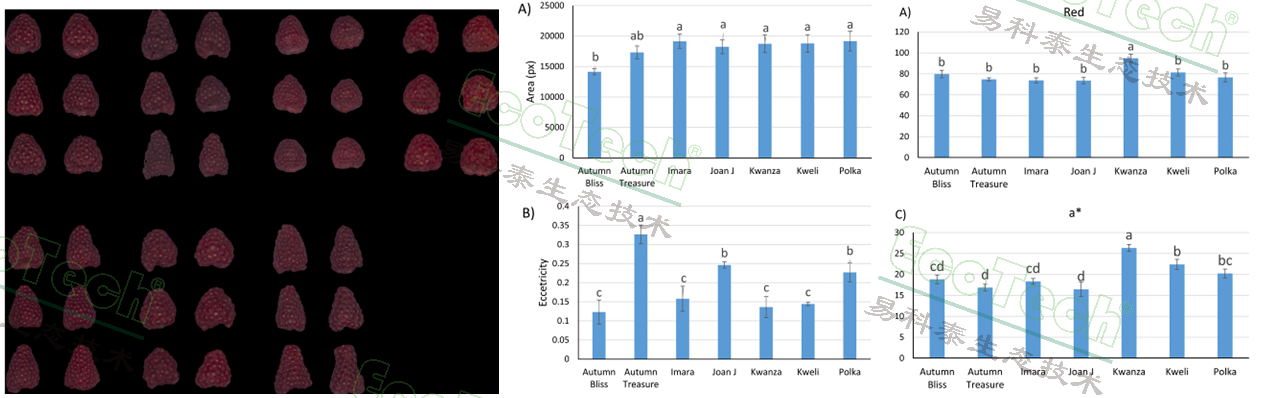 左圖:經(jīng)過背景去除的樹莓果實(shí)RGB成像圖;中圖:樹莓果實(shí)的形態(tài)數(shù)據(jù):面積和偏心率;右圖:樹莓果實(shí)的顏色數(shù)據(jù):平均紅度和CIE數(shù)值