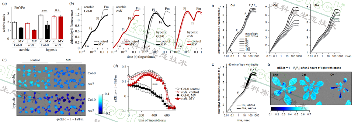 左圖:擬南芥rcd1突變體在低氧環(huán)境下的OJIP曲線與φRE1o(PSI電子受體的電子流量子產(chǎn)額)成像圖與數(shù)據(jù)(Shapiguzov,2019);右圖:擬南芥在臭氧和光照處理后的OJIP曲線與成像圖(Morales, 2021)