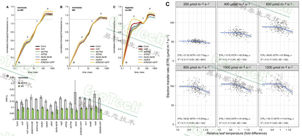 左圖:擬南芥在正常含氧量環(huán)境與缺氧環(huán)境下添加或不添加百草枯(MV)的OJIP曲線與φRE1o(PSI電子受體的電子流量子產(chǎn)額)數(shù)據(jù)圖(Punkkinen,2025);右圖:蠶豆不同光照條件下相對(duì)葉溫與電子傳遞速率ETR的相關(guān)性(Shapiguzov,2025)
