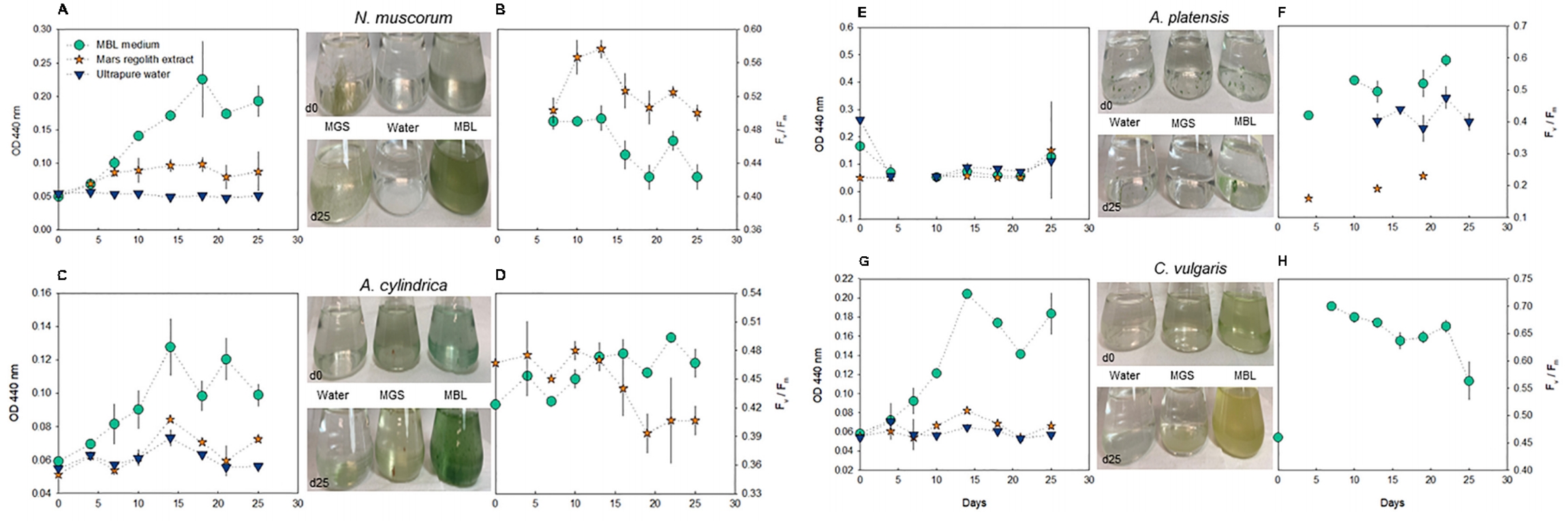 葡萄牙阿威羅大學(xué)的科學(xué)家研究了3種藍(lán)藻(柱孢魚腥藻Anabaena cylindrica、念珠藻Nostoc muscorum和鈍頂節(jié)旋藻Arthrospira platensis)和1種綠藻(小球藻Chlorella vulgaris)能否利用火星現(xiàn)有資源生活。他們利用美國月球和小行星表面科學(xué)中心提供的火星風(fēng)化層模擬物(MGS-1)制作成水提物,之后將這幾種微藻分別培養(yǎng)在純水、火星風(fēng)化層水提物和17%螺旋藻培養(yǎng)基中,定期測量其光密度OD440并使用FluorCam葉綠素?zé)晒獬上裣到y(tǒng)測量其最大光化學(xué)效率Fv/Fm。