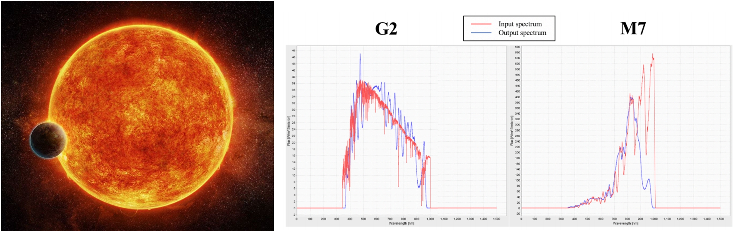左圖:M矮星示意圖;右圖:太陽G2與M矮星M7的光譜曲線