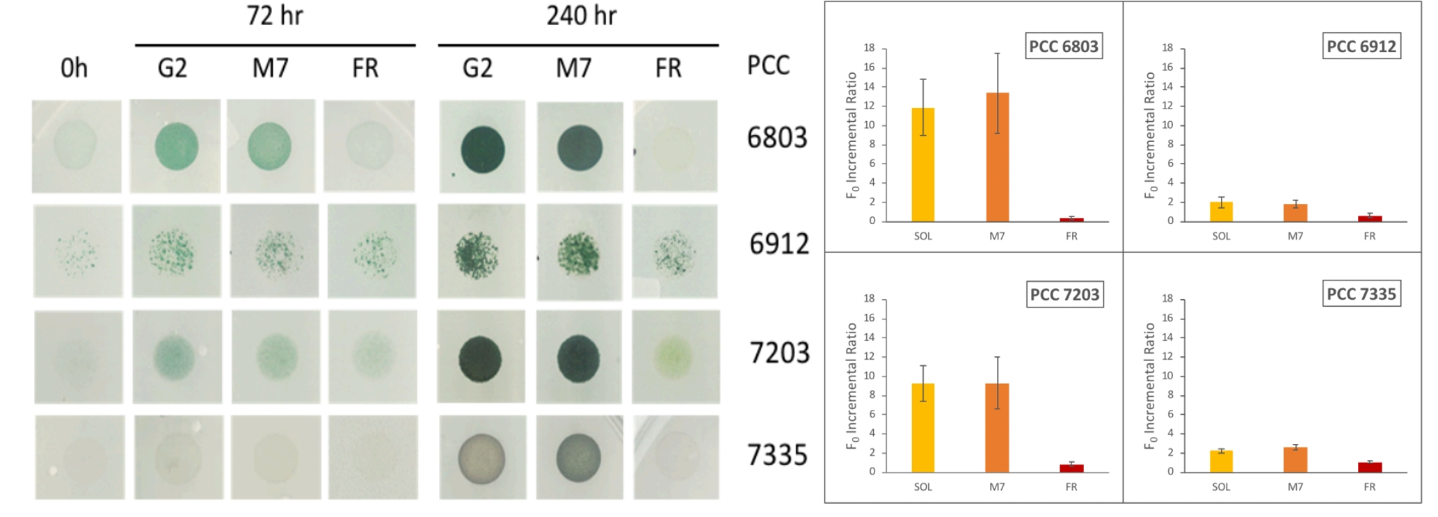 4種藍(lán)藻在太陽光、M7光照、遠(yuǎn)紅光下的照片和F0增長率