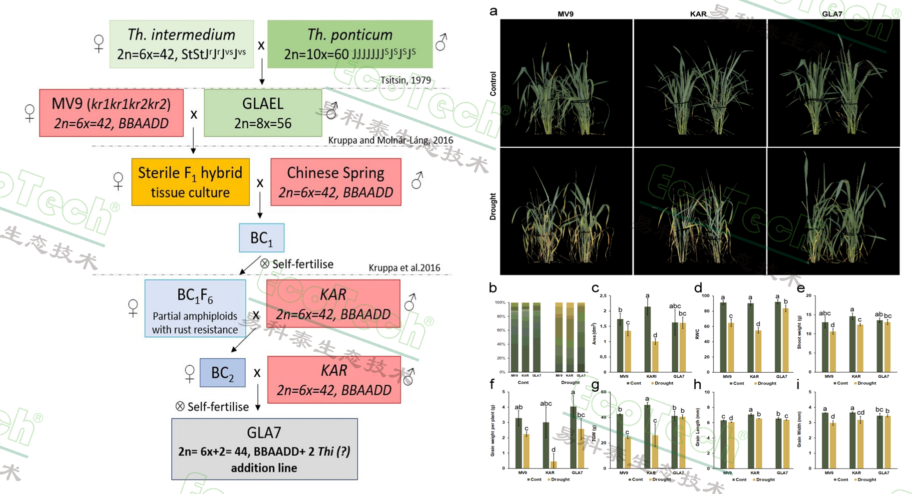 左圖:GLA7的發(fā)展過程;右圖:通過PlantScreen傳送帶表型成像系統(tǒng)測量GLA7、MV9 和KAR的RGB成像圖與形態(tài)表型數據,包括色彩分割(不同色彩比例)、植株面積等