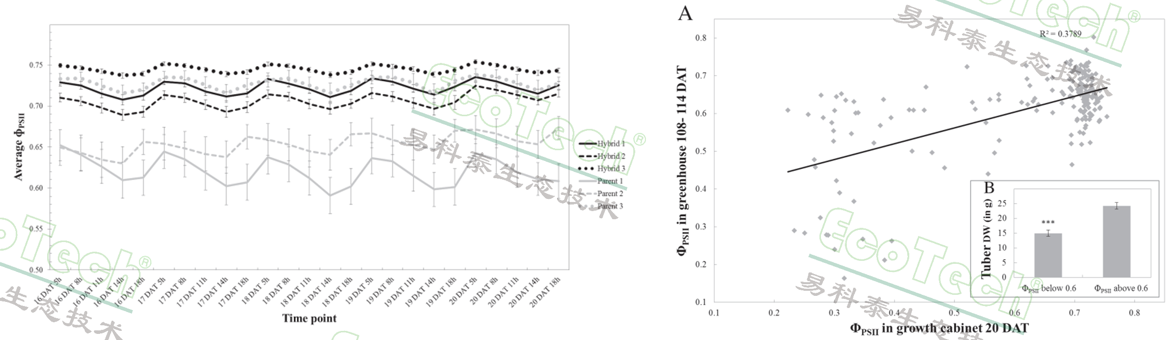 左圖:雜交種和親本的ΦPSII時間動態(tài)曲線;右圖:不同生長階段ΦPSII與最終塊莖產量