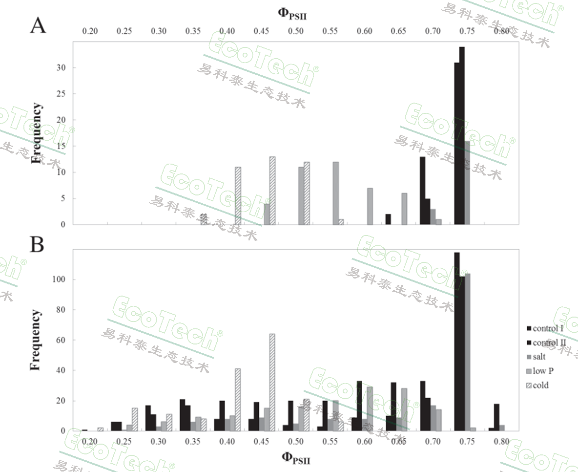 兩個雜交種在不同脅迫條件下的ΦPSII頻率分布直方圖