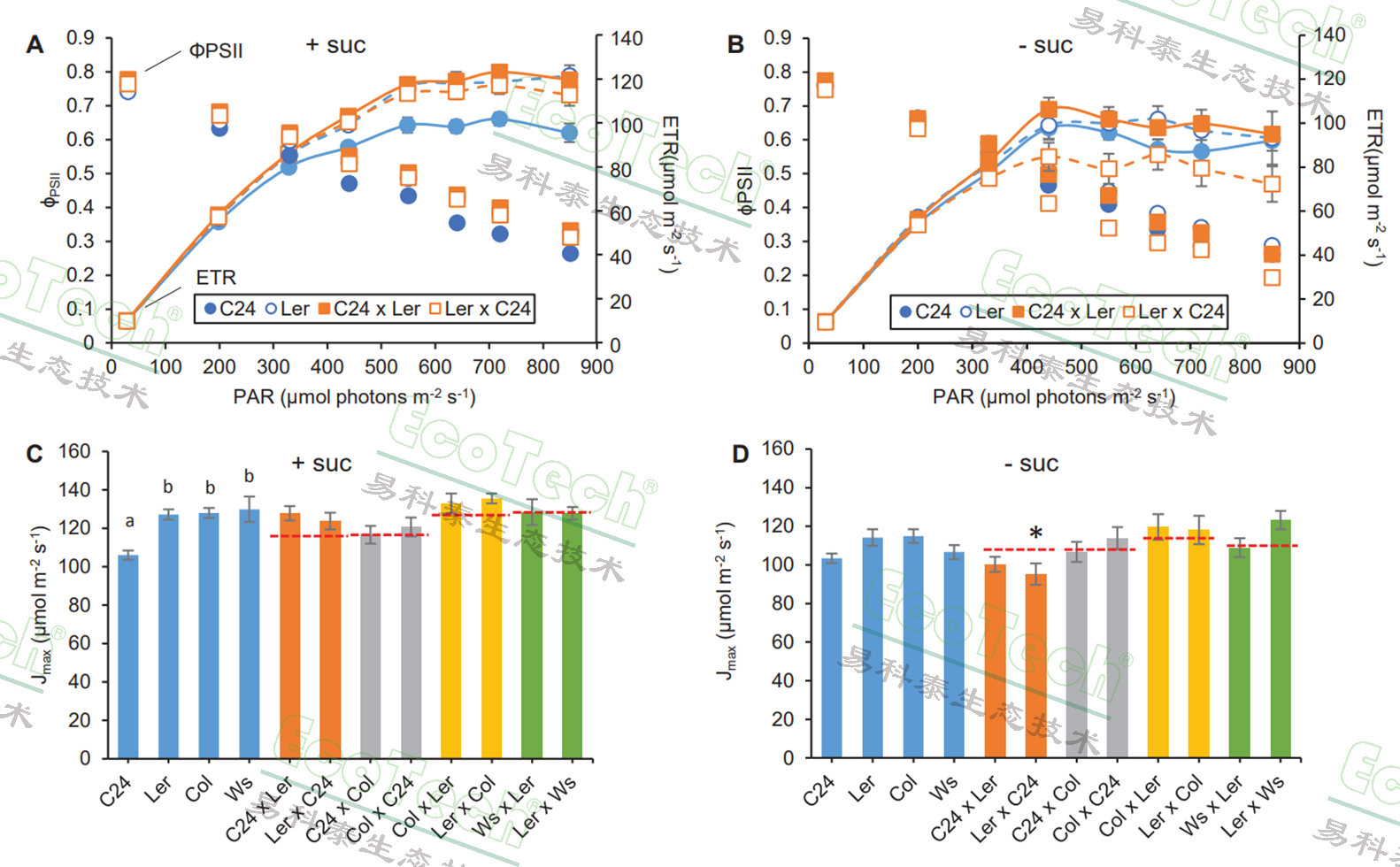 研究人員通過FluorCam葉綠素熒光成像系統(tǒng)的light curve光響應曲線測量程序,測量了雜交種和親本在不同光強下的量子產額ΦPSII與電子傳遞速率ETR,并進一步擬合出最大電子傳遞速率Jmax(即ETRmax)。結果表明雜交種和親本在光系統(tǒng)II效率方面沒有顯著差異。