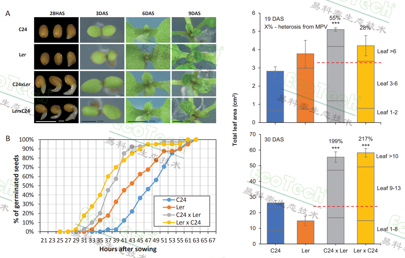 擬南芥Arabidopsis thaliana雜交種往往會表現出生物量增加的雜種優(yōu)勢。澳大利亞聯邦科學和工業(yè)研究組織與悉尼科技大學合作,旨在確定擬南芥雜交種生物量增加是由于單位葉面積光合效率提高,還是總體葉面積增加導致總光合產物增多。