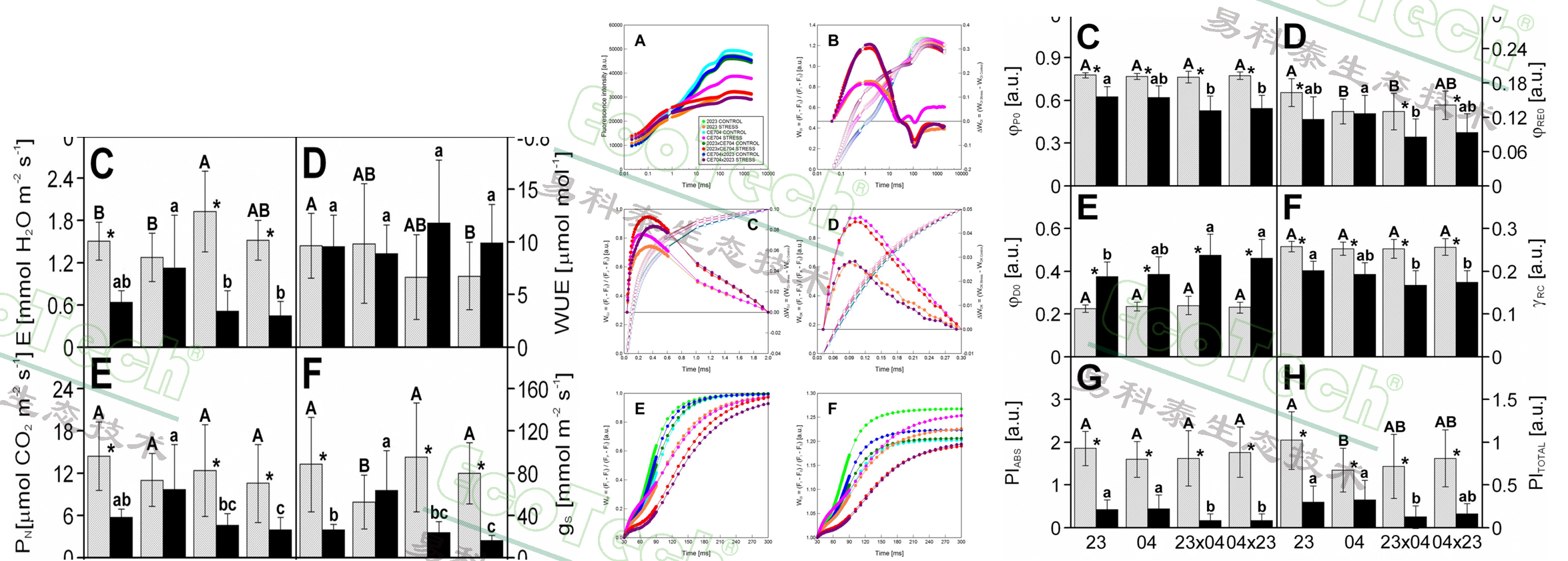 左圖:光合儀測量的凈光合速率(Pn)、蒸騰速率(E)、氣孔導度(gs)、水分利用效率(WUE)等;中圖:FluorPen手持式葉綠素熒光儀測量的OJIP快速葉綠素熒光動力學曲線;右圖;基于OJIP曲線得到的一系列參數