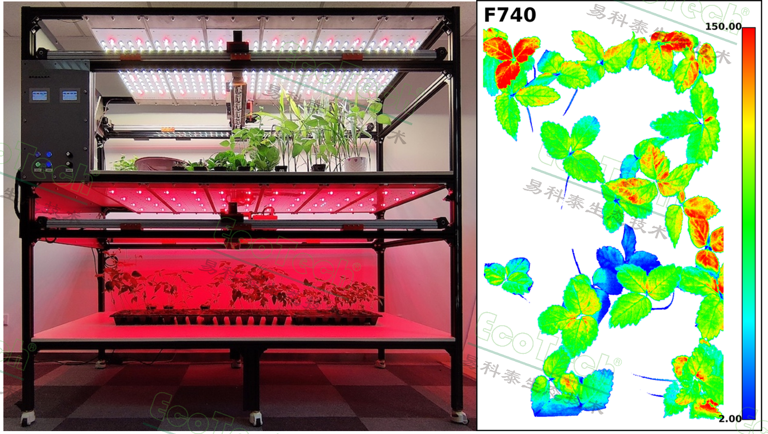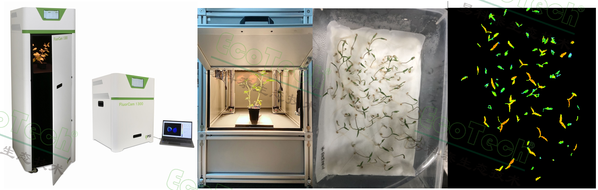 左圖:新一代FluorCam1300多激發(fā)光多光譜熒光成像系統(tǒng);中:FluorTron®植物光合表型成像分析系統(tǒng);右:利用易科泰葉綠素熒光成像技術測量番茄種子萌發(fā)率并評估種苗活力