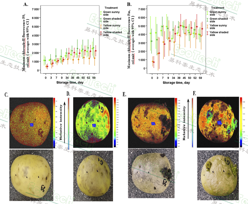A:不同處理下, F0隨著時(shí)間的變化;B:不同處理下, Fm隨著時(shí)間的變化;C:0天,黃色馬鈴薯的F0(上)圖像和RGB圖片(下);D:0天,帶綠色斑點(diǎn)馬鈴薯的F0(上)圖像和RGB圖片;E:59天,黃色馬鈴薯的F0(上)圖像和RGB圖片(下);F:59天,帶綠色斑點(diǎn)馬鈴薯的F0(上)圖像和RGB圖片