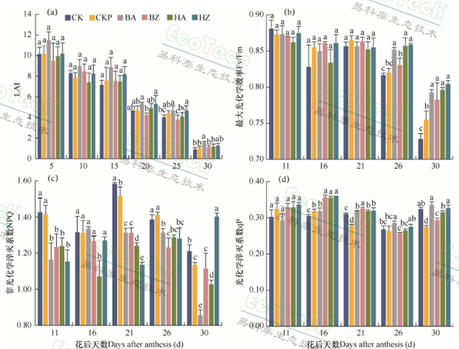實(shí)驗(yàn)共設(shè)6種處理:空白對(duì)照CK(拔節(jié)期和開(kāi)花期均噴施自來(lái)水處理)、制劑組對(duì)照CKP(兩個(gè)時(shí)期均噴施磷酸二氫鉀溶液處理)、拔節(jié)期噴施磷胺制劑(BA)、拔節(jié)期噴施磷酯制劑(BZ)、開(kāi)花期單次噴施磷胺制劑(HA)、開(kāi)花期單次噴施磷酯制劑(HZ),測(cè)定在不同處理下的旗葉的葉綠素?zé)晒鈪?shù)值,實(shí)驗(yàn)結(jié)果如下: