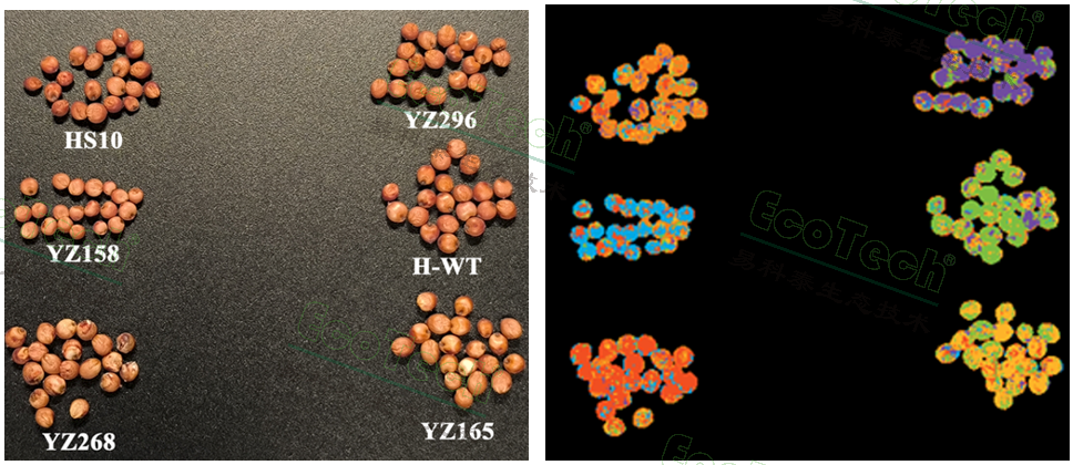 右圖:不同種質藍綠熒光指數(shù)圖(EcoTech®實驗室供圖)