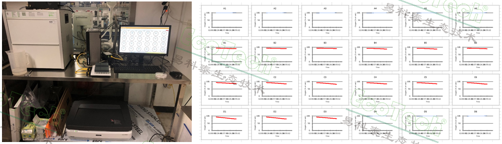 右圖:24通道的種子耗氧曲線(藍色曲線為空白對照,紅色曲線為不同處理的測試種子)