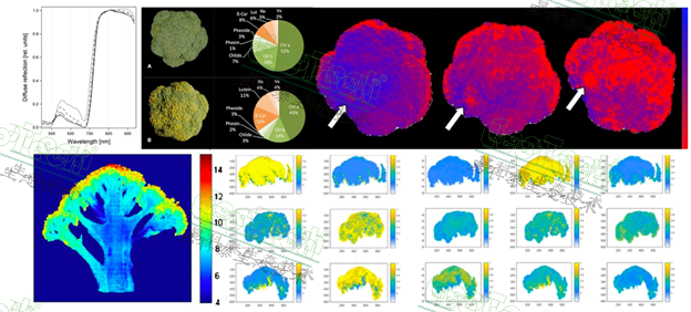 右圖為從左到右:采用高光譜成像技術(shù)及葉綠素?zé)晒獬上窦夹g(shù)檢測花椰菜新鮮程度、硫苷(功能成分)含量(引自Theresa Kabakeris,Leibniz-Institut für Agrartechnik und Bioökonomie,2018;José Miguel Hernández-Hierro etc. Journal of Food Engineering, 2014