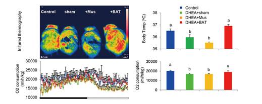 案例2、在2016年發(fā)表的“Brown adipose tissue transplantation ameliorates polycystic ovary syndrome”一文中,通過使用紅外熱成像與能量代謝測(cè)量系統(tǒng)的結(jié)合對(duì)多囊卵巢綜合征(PCOS)大鼠進(jìn)行測(cè)量,最終發(fā)現(xiàn)棕色脂肪組織(BAT)移植激活內(nèi)源性BAT,從而增加脂聯(lián)素的循環(huán)水平,其在全身能量代謝和卵巢生理學(xué)中起重要作用。與BAT移植一致,脂聯(lián)素蛋白的施用顯著地挽救了DHEA誘導(dǎo)的PCOS表型。這些結(jié)果強(qiáng)調(diào)內(nèi)源性BAT活性與PCOS表型的發(fā)展密切相關(guān),并且BAT活化可能是治療PCOS的有希望的治療選擇。