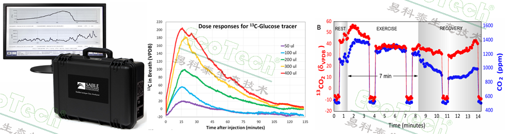 動(dòng)物呼吸代謝測量可以得到二氧化碳產(chǎn)量、耗氧量、呼吸商等能量代謝指標(biāo),但不能跟蹤研究三種不同營養(yǎng)物質(zhì)(能量來源物質(zhì)如蛋白質(zhì)、脂肪及碳水化合物)的實(shí)際利用情況,特別是外源性與內(nèi)源性營養(yǎng)物的氧化等。國際知名動(dòng)物能量代謝技術(shù)公司Sable Systems International新推出了動(dòng)物呼吸穩(wěn)定同位素氣體分析儀,可與動(dòng)物呼吸代謝測量系統(tǒng)搭配用于動(dòng)物穩(wěn)定同位素呼吸代謝檢測以深入研究分析其能量代謝跟蹤底物消耗情況。該系統(tǒng)可廣泛應(yīng)用于昆蟲、鳥類、蜥蜴、實(shí)驗(yàn)大小鼠、家畜家禽、靈長類等各種實(shí)驗(yàn)動(dòng)物,以及人體碳同位素呼吸與能量代謝實(shí)時(shí)監(jiān)測,非常有助于推動(dòng)動(dòng)物生理生態(tài)、營養(yǎng)學(xué)、比較生理學(xué)、運(yùn)動(dòng)科學(xué)、病理學(xué)、生物醫(yī)學(xué)等領(lǐng)域生物新陳代謝創(chuàng)新研究。