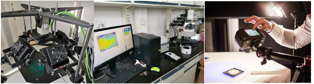 紫菜病害感染后的葉綠素?zé)晒怙@微成像圖:左:最大熒光Fm,中:最大光化學(xué)效率Fv/Fm;1為病害最初感染區(qū)域,2為病害擴(kuò)散區(qū)域,3為尚未感染區(qū)域;右:工作中的FKM系統(tǒng)