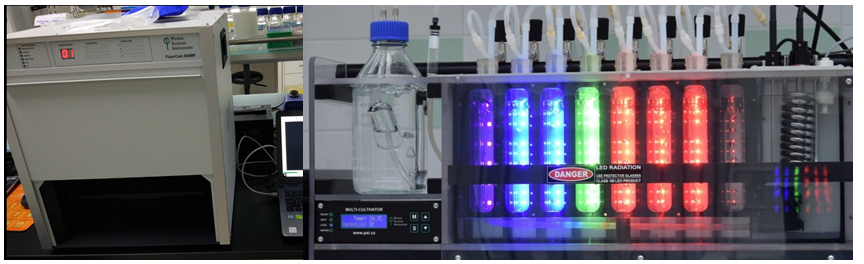 左:衣藻野生型和兩種突變株的NPQ曲線、不同培養(yǎng)條件及其生長(zhǎng)曲線;右:MC1000 8通道藻類培養(yǎng)監(jiān)測(cè)系統(tǒng)
