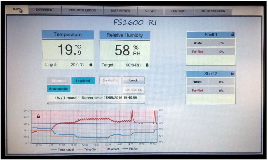 允許用戶自編程的環(huán)境控制程序使得研究者可以模擬自然條件??煽貐?shù)包括:溫度,相對濕度和具有獨立光周期的輻射情況??赏ㄟ^編程實現(xiàn)具有“黎明/黃昏”和“多云天氣”效應(yīng)的“晝/夜”循環(huán)。而且,葉綠素?zé)晒獗O(jiān)測模塊可以持續(xù)測量培養(yǎng)植物的基本熒光參數(shù)并反映植物生長狀況。