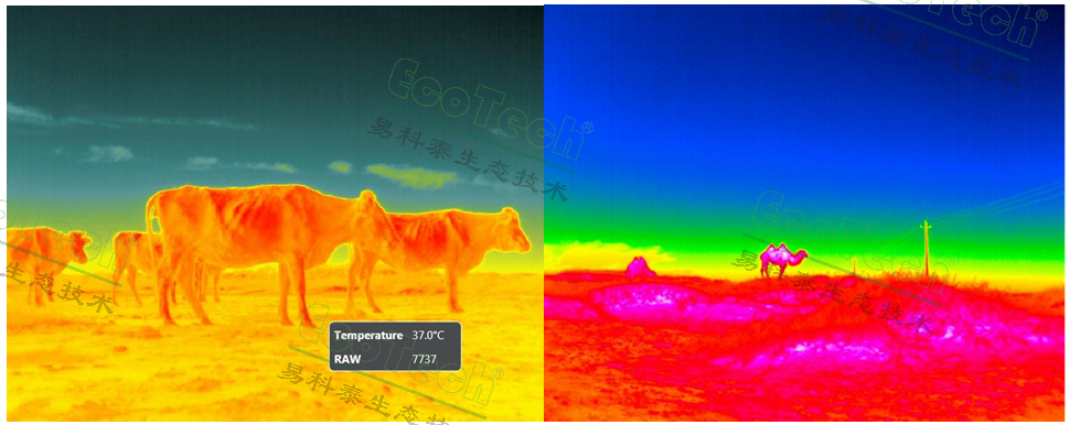 左圖:蒙古牛紅外熱成像圖;右圖:沙漠駱駝紅外熱成像圖