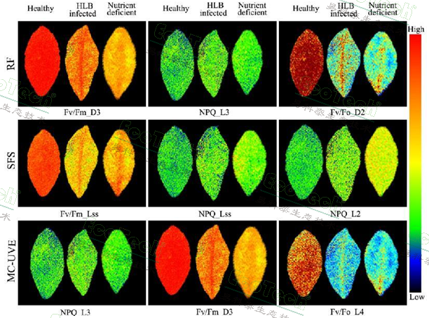 為深入解析HLB感染葉片的光合特征,本研究采用三種特征選擇方法結(jié)合監(jiān)督分類器進(jìn)行算法分析,成功識別出該病害特有的熒光信號,并實現(xiàn)健康葉片、HLB感染葉片及營養(yǎng)缺乏葉片的精準(zhǔn)分類。