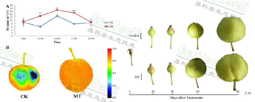 西北農(nóng)林科技大學(xué)的研究者們利用FluorCam葉綠素?zé)晒獬上?,針?duì)褪黑素對(duì)早酥梨果實(shí)生理特性的影響進(jìn)行了探究(Jianlong Liu,2019)。結(jié)果表明,在果實(shí)膨大階段,褪黑素(MT)處理過的水果中最大光量子產(chǎn)量(Fv/Fm)保持在0.82左右,未處理過的水果(CK)中為0.73,褪黑素增強(qiáng)了梨果實(shí)的光合能力,提高了單果重量。