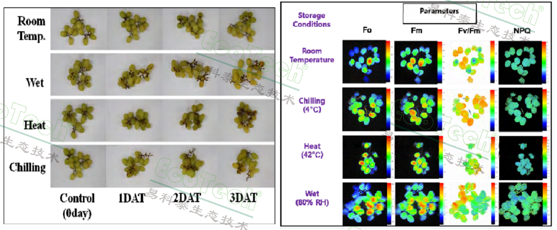 利用FluorCam葉綠素?zé)晒獬上耔b定葡萄果實(shí)新鮮度(YOO, 2015)。新鮮葡萄分別置于室溫、加濕、高溫、寒冷的環(huán)境下存儲(chǔ),一定時(shí)間后分別檢測(cè)樣品葡萄光合狀態(tài)的變化。結(jié)果顯示,葡萄果實(shí)中Fv / Fm、ΦPSII和NPQ的數(shù)值變化在熱條件下高于其他條件。低溫(4°C)和潮濕條件可保持Fv / Fm值在0.8作用,生理狀態(tài)相對(duì)更加穩(wěn)定,可作為綠色葡萄果實(shí)的合適存儲(chǔ)方法。