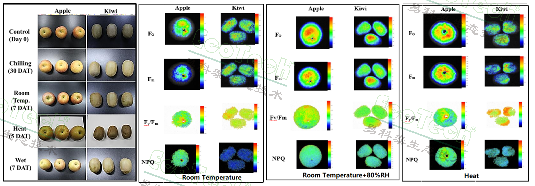 利用FluorCam評(píng)估室溫、高溫、高濕等不同儲(chǔ)存條件下保存的蘋果和獼猴桃的新鮮品質(zhì)。研究表明,在熱脅迫下,蘋果和獼猴桃Fv / Fm、ΦPSII和NPQ的變化均高于其他脅迫下的變化。低溫(4°C)下其光合狀態(tài)則保持相對(duì)穩(wěn)定,此條件下保存的果實(shí)新鮮品質(zhì)較高。