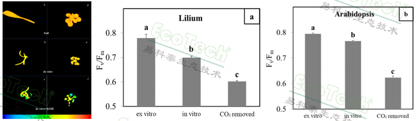 本研究以組織培養(yǎng)的百合鱗片(再生不定鱗莖)和擬南芥幼苗為材料,通過在培養(yǎng)容器中放置濃KOH溶液去除二氧化碳,探究其對(duì)組培苗的影響。結(jié)果顯示,低CO2水平下,百合再生鱗莖和擬南芥幼苗生長(zhǎng)減弱,添加蔗糖僅能部分恢復(fù)生長(zhǎng)。ROS大量積累。Fv/Fm分別從 0.69、0.76 降至 0.60、0.62,而土壤中生長(zhǎng)的離體幼苗的兩者 Fv/Fm 分別為 0.77、0.79。這表明低二氧化碳濃度會(huì)干擾光合功能并引發(fā)組培脅迫,組培苗生長(zhǎng)不良部分源于光合能力大幅下降。