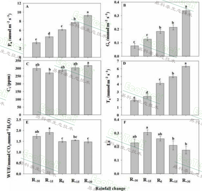 研究設(shè)置 5 個(gè)降雨梯度(基準(zhǔn)值±15%、±30% 及基準(zhǔn)值),采用易科泰光合表型方案測(cè)定裸果木幼苗的凈光合速率、蒸騰速率等氣體交換參數(shù),并通過(guò)光響應(yīng)曲線分析獲得表觀量子效率、最大光合速率等核心指標(biāo)。結(jié)果顯示,降雨增加顯著提升裸果木凈光合速率和蒸騰速率,而降雨減少時(shí),凈光合速率下降由氣孔限制(減少 15%)和非氣孔限制(減少 30%)共同導(dǎo)致,同時(shí)葉片瞬時(shí)水分利用效率顯著提高。