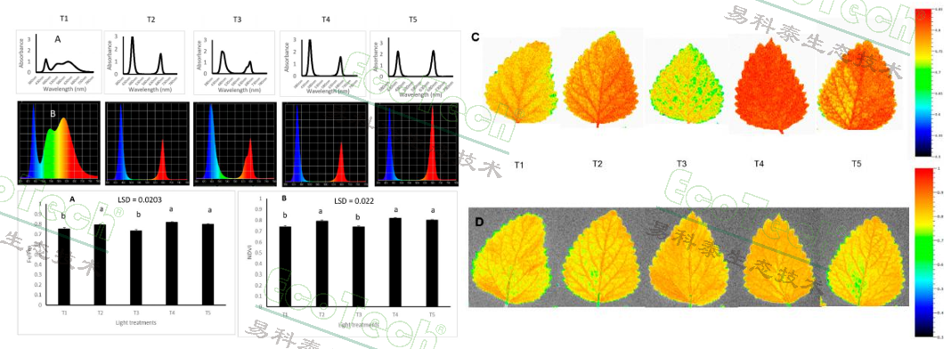上圖為香蜂草5種不同光配方的光譜組成;下圖為香蜂草Fv/Fm、NDVI成像圖