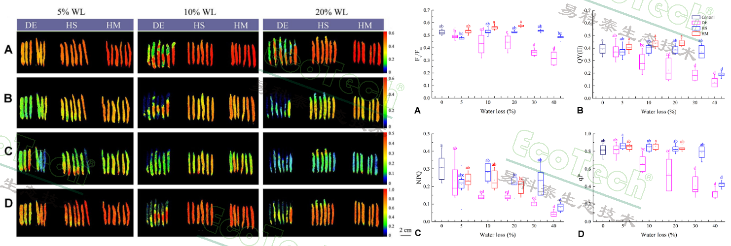 圖2:不同處理(干燥、高鹽度、高甘露醇濃度)條件下條斑紫菜的葉綠素?zé)晒鈪?shù)差異(Du G, etc. 2022)